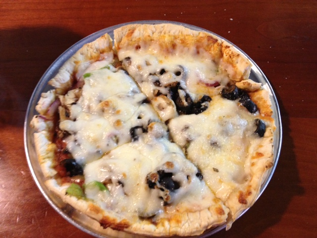 At Main Street Pizza, they have a small pizza, with a thin crust that’s been baked just right. The pizza is just the right size for each of us, and each has the same taste as either a medium or a large – so you don’t lose any toppings and don’t lose any flavors.