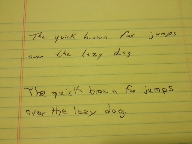 I’m right-handed and have terrible handwriting. Here’s what mine looks like. My right-hand writing is on top.
