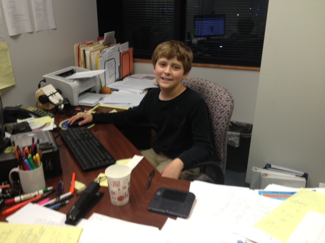 Because what he thinks is big time is hanging out in dad’s office. Camping out he calls it.